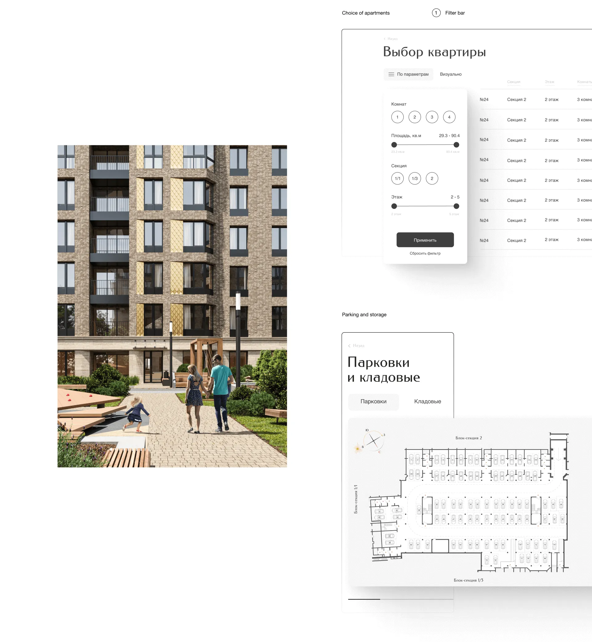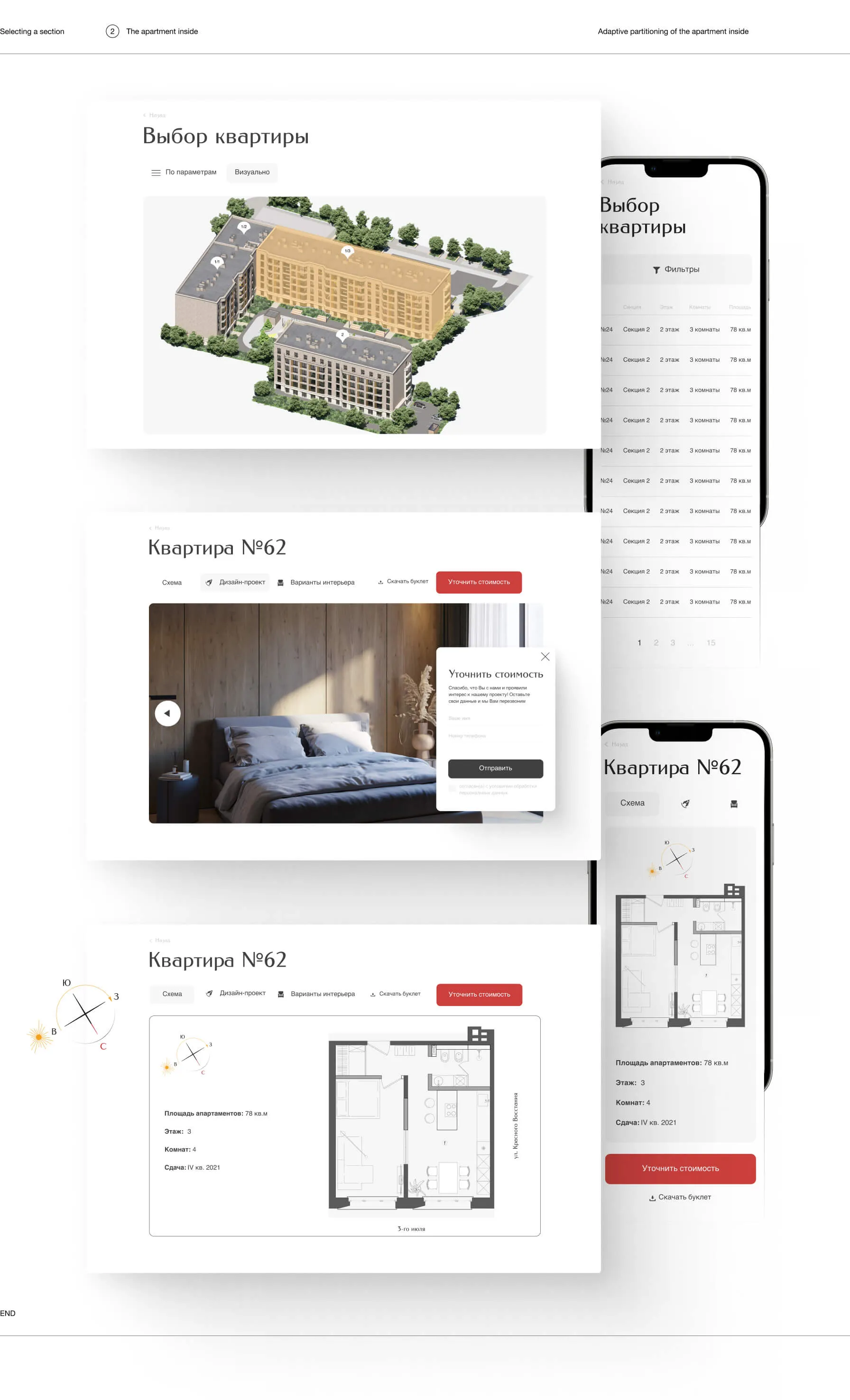 Вы можете выбрать нужную секцию и перейти к самой важной части сайта — подбору квартир. С помощью удобного интерфейса можно настроить фильтр по параметрам: выбрать количество комнат, этаж и площадь квартиры.