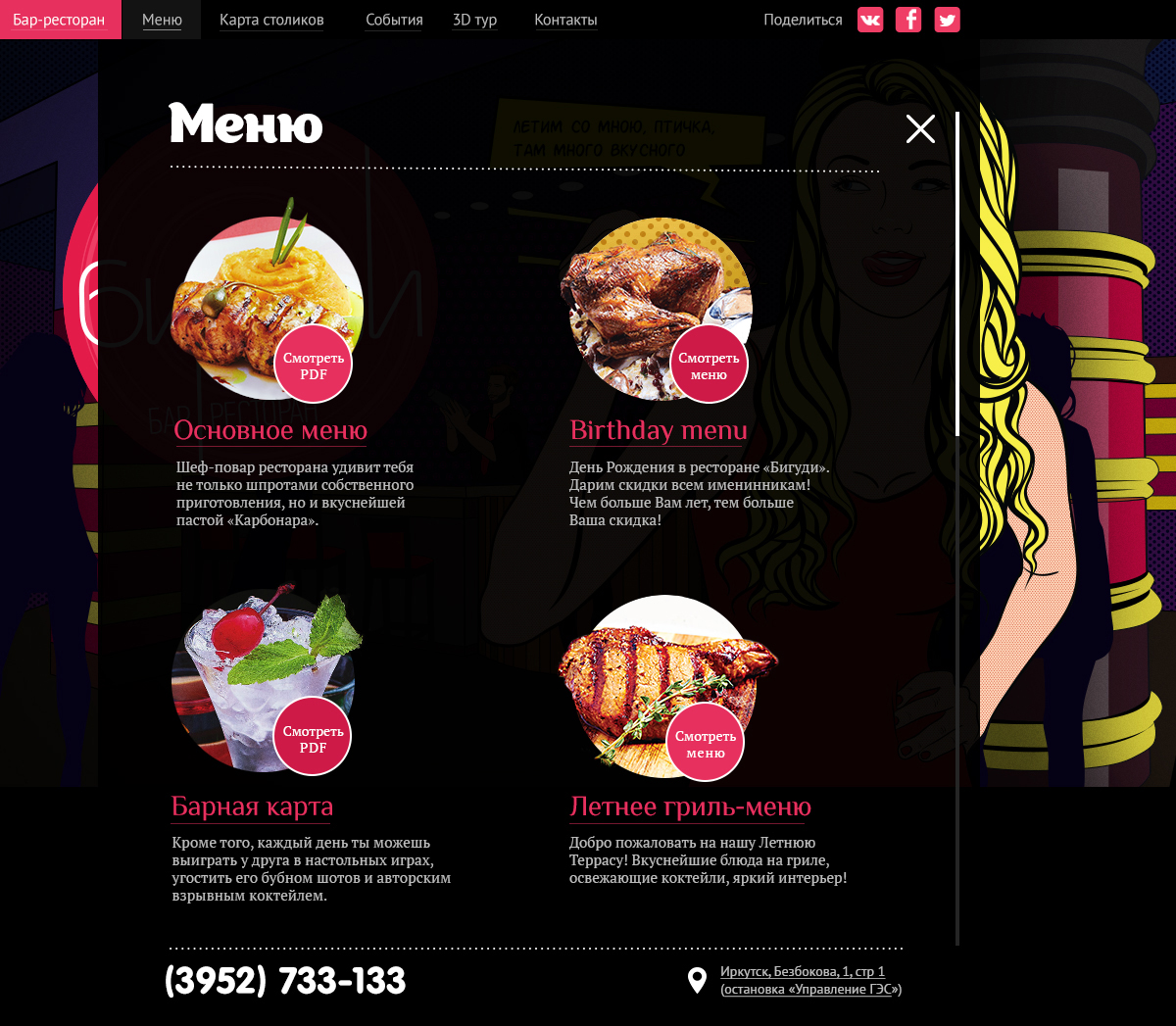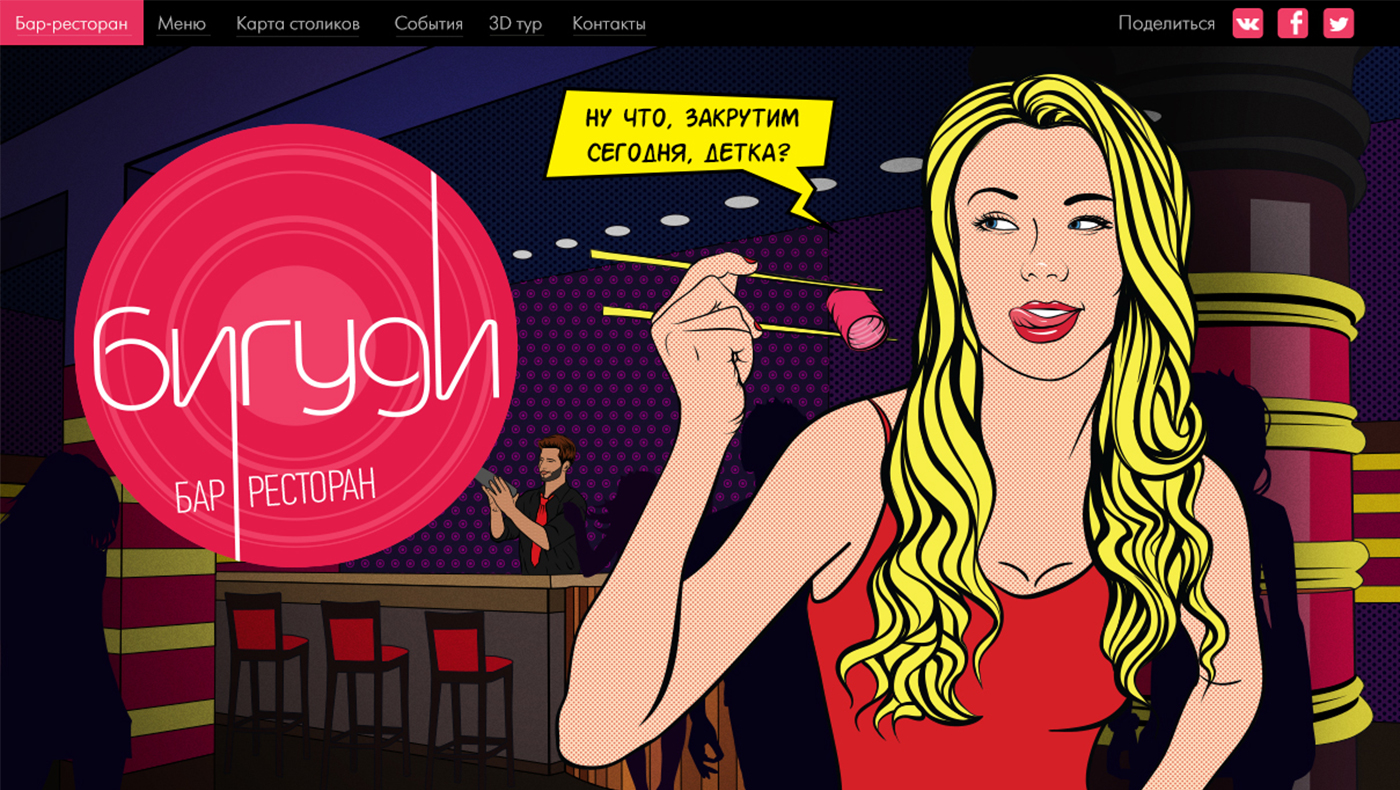 Бар-ресторан «Бигуди» начал свою работу в Иркутске весной 2013 года. Новому яркому заведению понадобился такой же запоминающийся сайт.