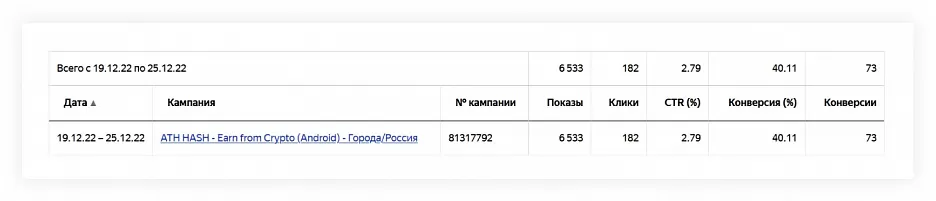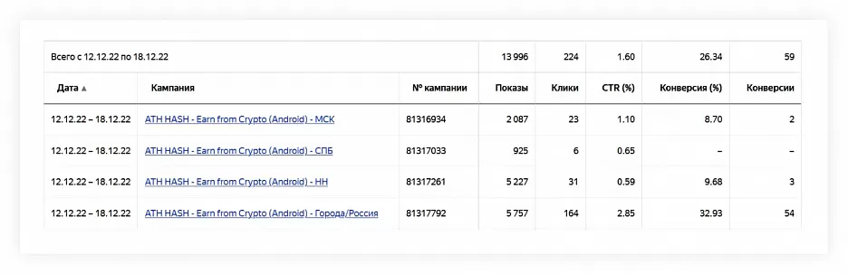Для успешной работы кампании типа РМП и ее оптимизации по целевым действиям, например, по установкам, она должна получать по 10 таких целевых действий в день или 70 в неделю. Наша статистика показывала, что разделение сыграло нам в минус. Каждая компания по отдельности не давала нужного количества установок.