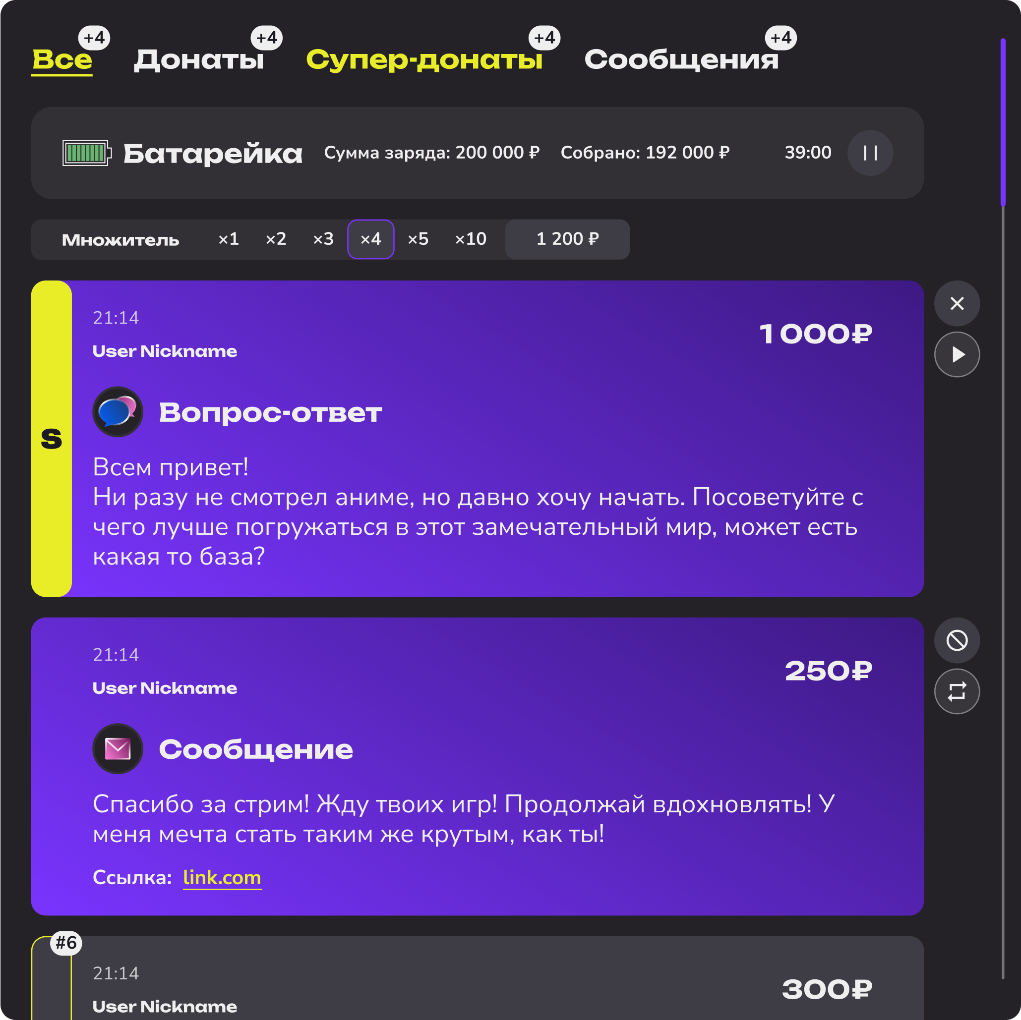 Мы переосмыслили привычный паттерн отправки доната и создали интерфейс-экосистему, где стример становится медиацентром, а зритель — со-автором эфира. Супер-донаты, живые опросы и барометр настроений запускаются запускаются за 3 клика, при прозрачной низкой комиссии.