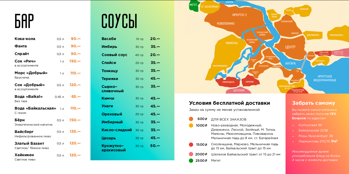 Глянцевый журнал очень хорошо попадал в женскую аудиторию, но создавал неправильные ожидания. Казалось, что цены в ресторане рассчитаны на состоятельных людей, а студентам здесь делать нечего. К тому же поддерживать такое меню было бы трудно: фотосессия с растениями требует большой подготовки, замена обложек и промополос выходила бы дороже. Кроме того, из-за листьев, использовавшихся как декорации, возникали ассоциации с другим иркутским рестораном.