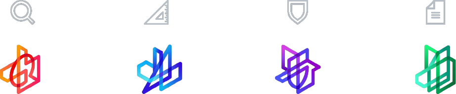 Логотип представляет собой сборный образ из элементов, символизирующих основные направления деятельности компании: документ, измерительная линейка, защищающий щит и высотное здание.
