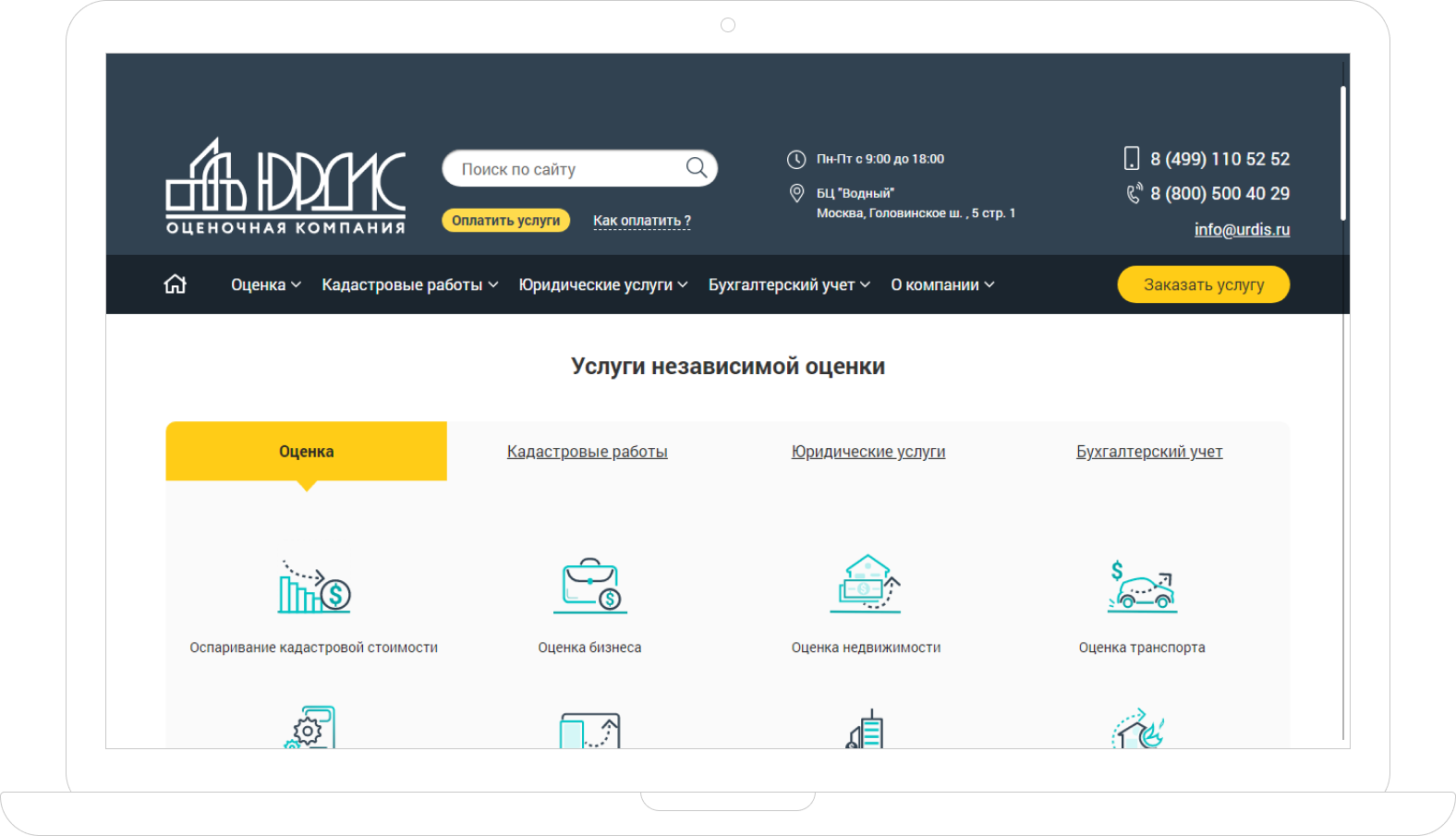 По гайду фирстиля клиент также обновил дизайн сайта компании Юрдис. Так, с минимальными затратами получился с более солидным дизайном и упорядоченной подачей информации, благодаря правильно примененным элементам фирменного стиля.